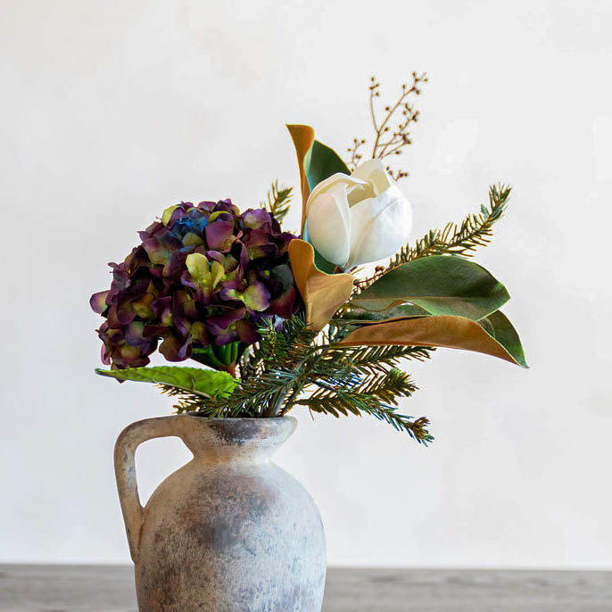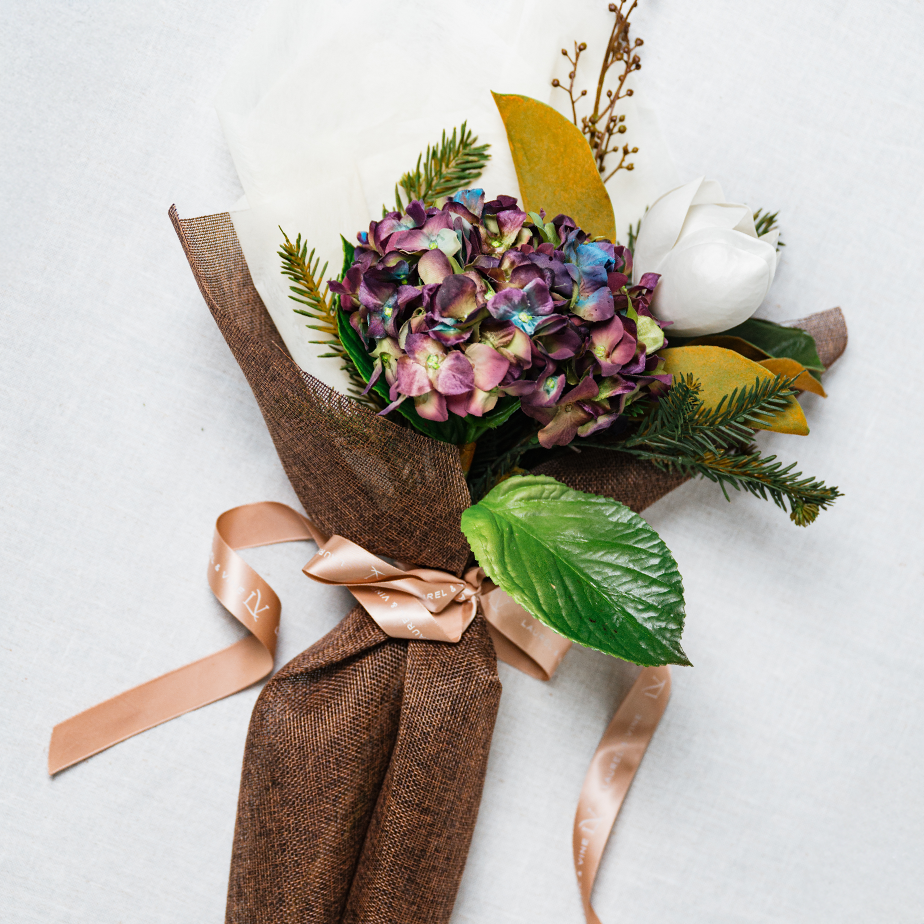 Rich and moody, Cedar & Stone channels the depth of winter through its layered textures and bold contrast. Magnolia buds bring a sense of purity amid dark hydrangea, artichoke, and cedar greenery, a striking arrangement that embodies the season’s beauty with warmth and intention.
