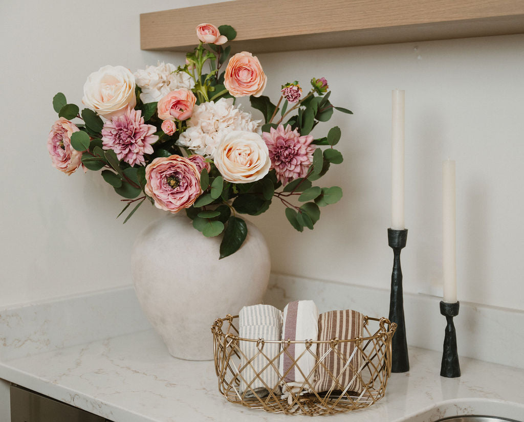A romantic composition of blush, peach, and mauve tones, Fleur Blanche feels both tender and expressive. Its sculpted blooms and airy silhouette bring a sense of poetry to any space, capturing that fleeting beauty of flowers at their most graceful moment.