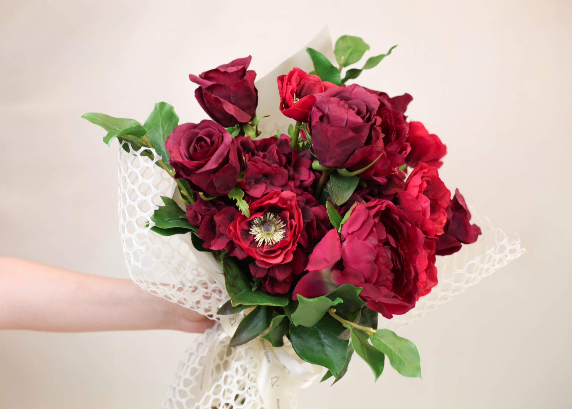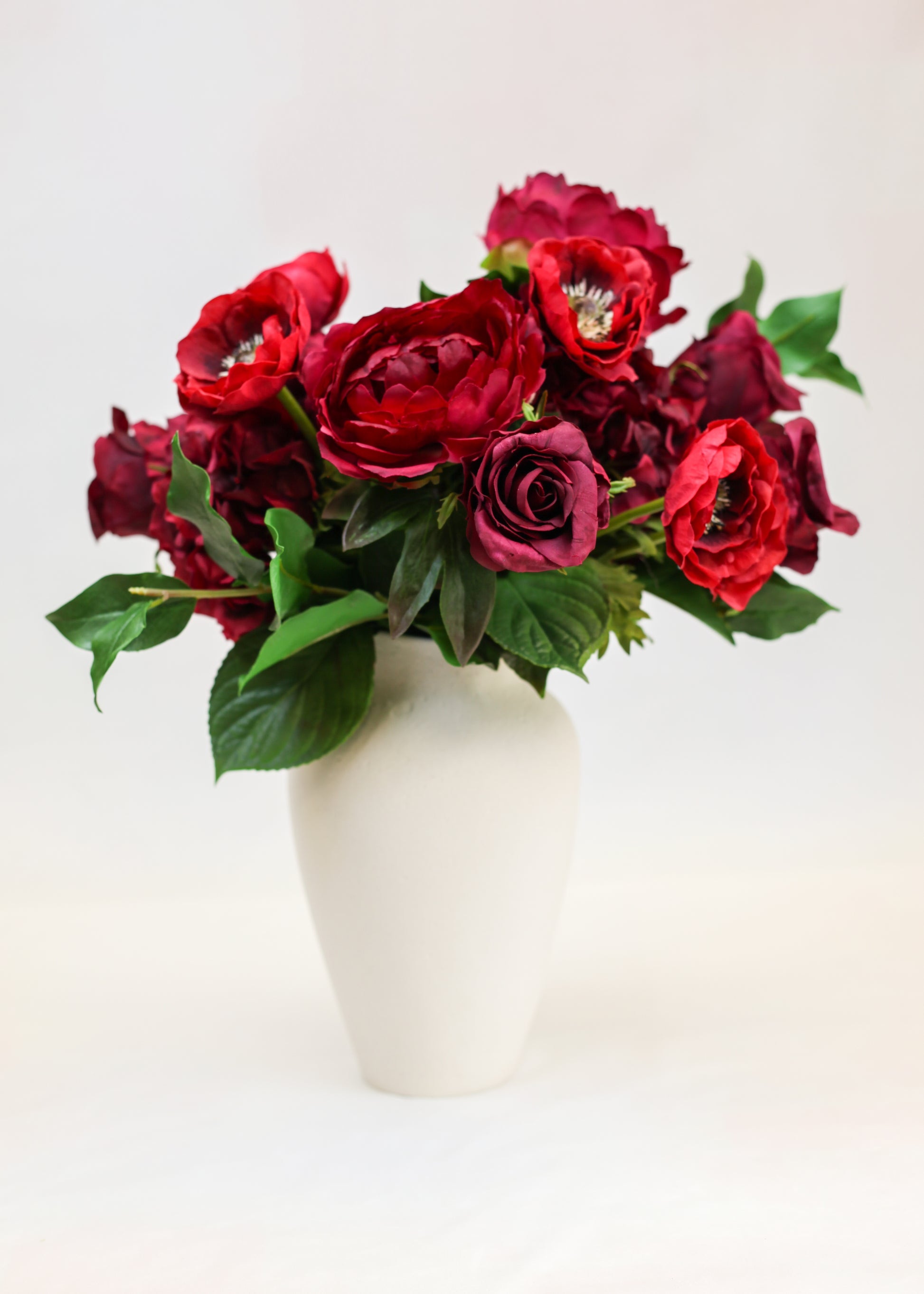 This arrangement is composed entirely of premium natural-touch florals, bringing together open peonies, garden anemones, Juliet rose buds, lush hydrangea, and sculptural salal leaf. Rich crimson and wine hues are balanced with organic greenery, creating depth, softness, and a quietly dramatic presence.