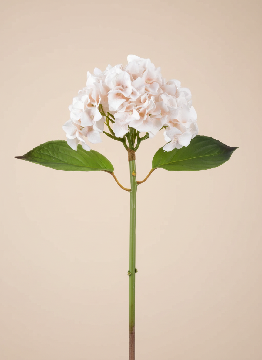 A full, rounded hydrangea bloom in soft blush tones with delicate petal layering and fresh green leaves. The subtle warmth of the color makes it perfect for romantic styling, bridal arrangements, or adding softness to neutral palettes.
