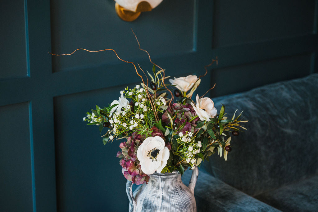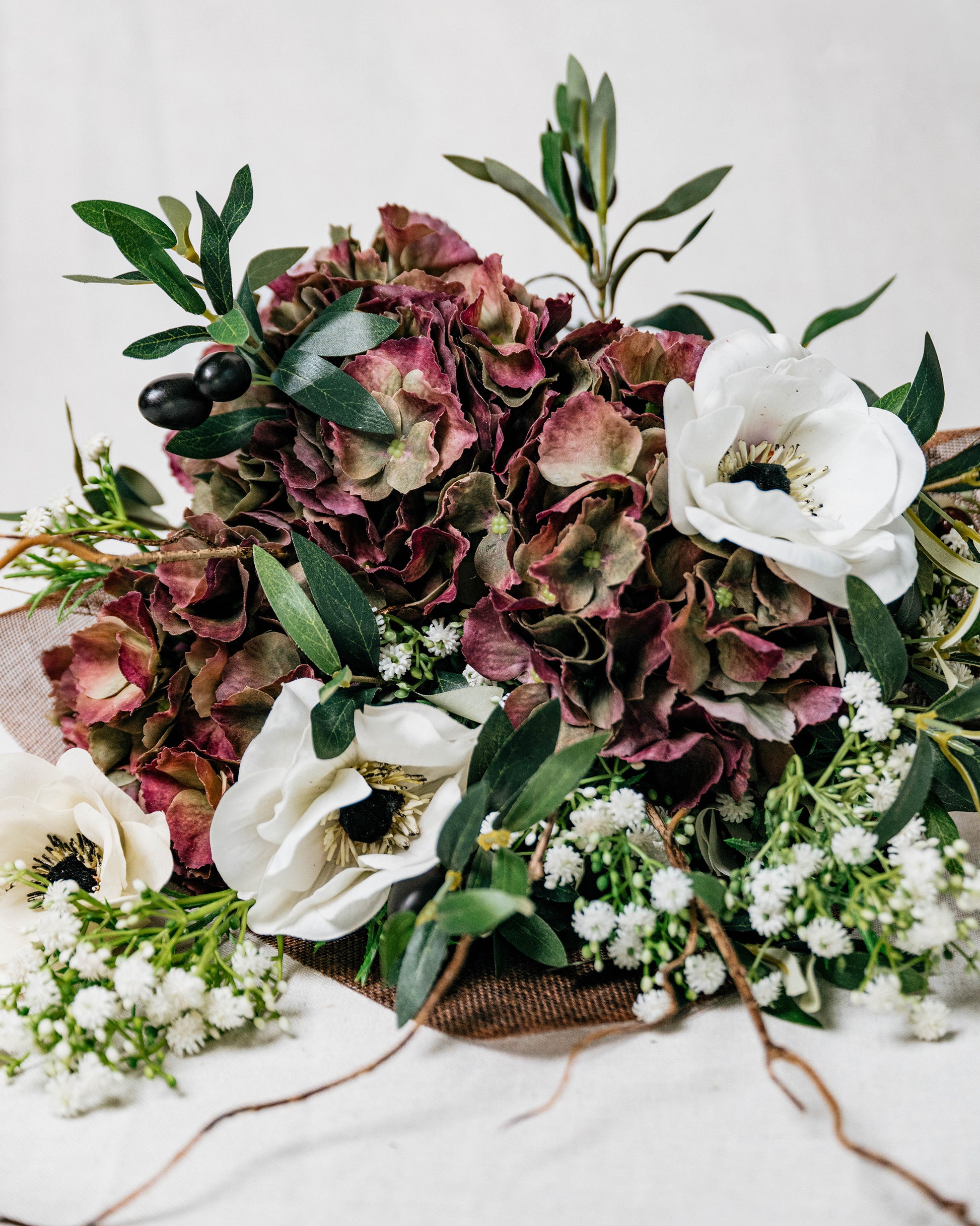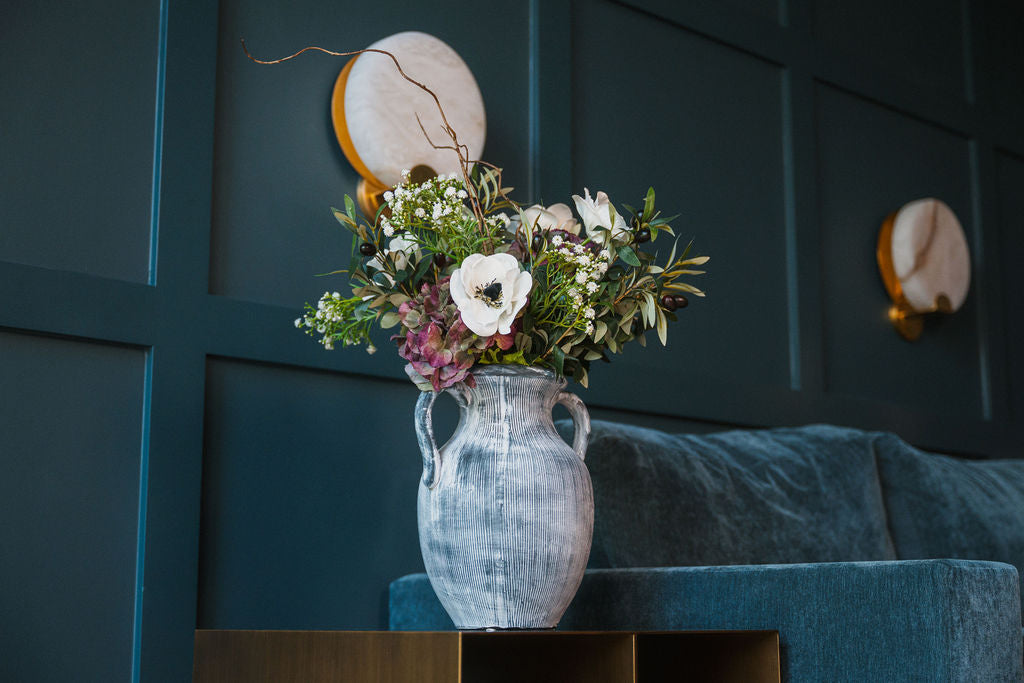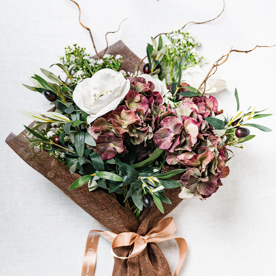 Rooted in organic elegance, Olea Grove draws inspiration from sculptural Mediterranean design. Crisp white blooms, rich olive greenery, and moody hydrangea create a statement arrangement that feels effortlessly refined, a balance of natural movement and style.