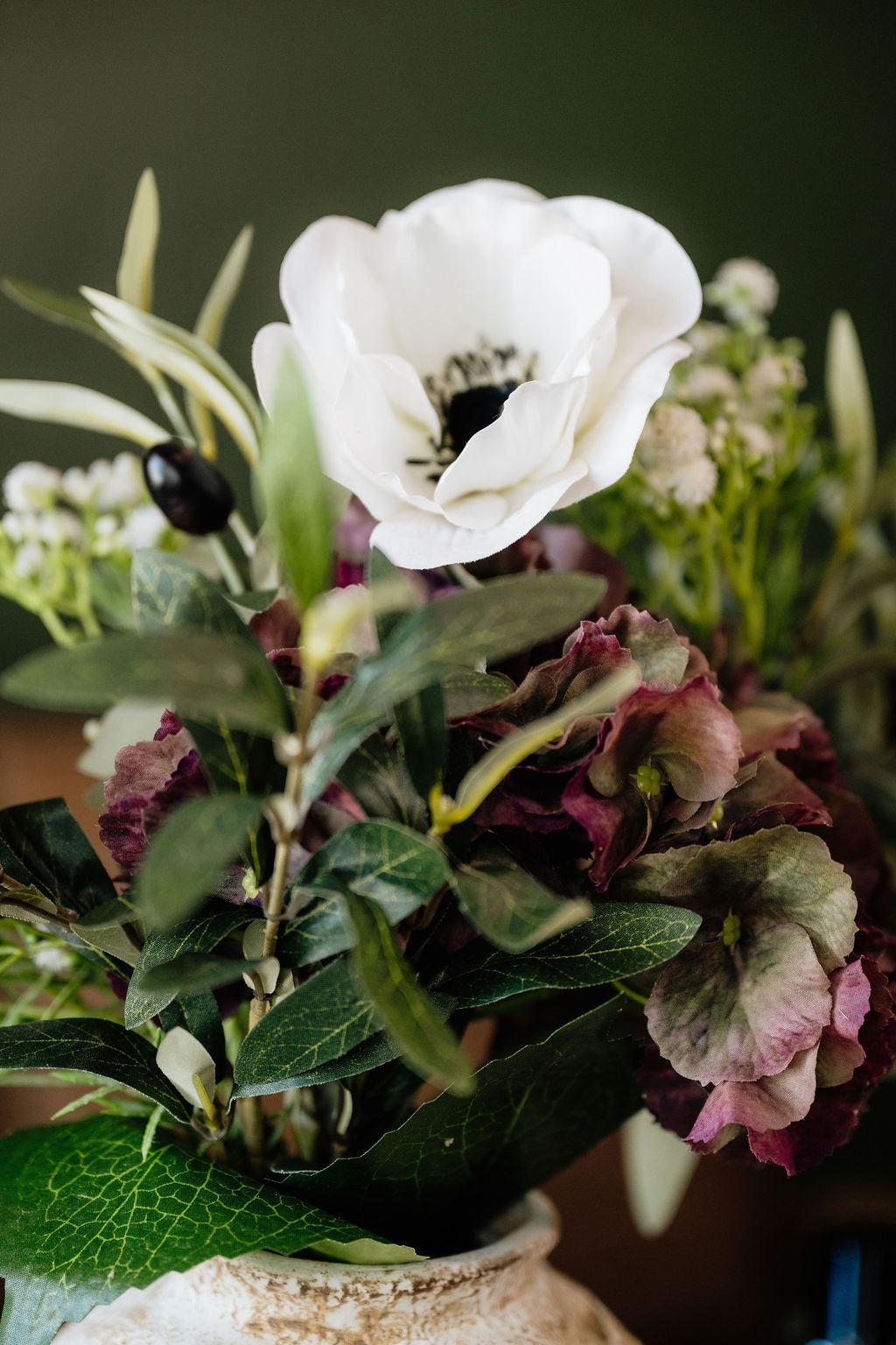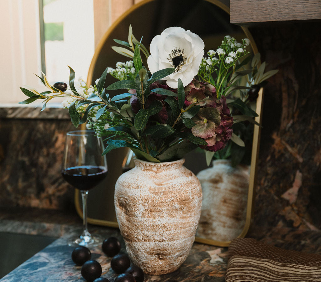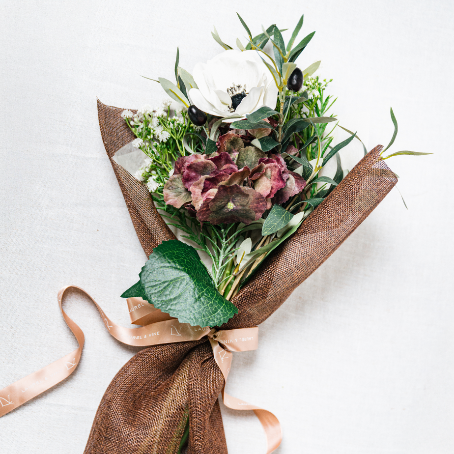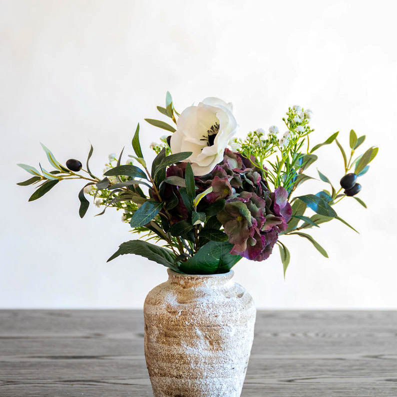 Rooted in organic elegance, Olea Grove draws inspiration from sculptural Mediterranean design. Crisp white blooms, rich olive greenery, and moody hydrangea create a statement arrangement that feels effortlessly refined, a balance of natural movement and style.