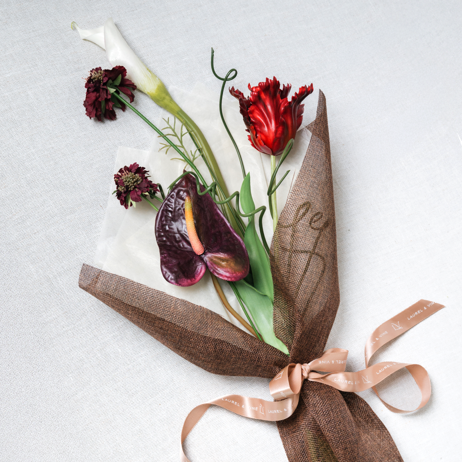 Bold and dramatic, Velvet Calla embodies dark beauty with artistic edge. Deep plum and burgundy blooms contrast against crisp white lilies and reeds, creating a design that feels moody, expressive, and unapologetically striking, a true statement.
